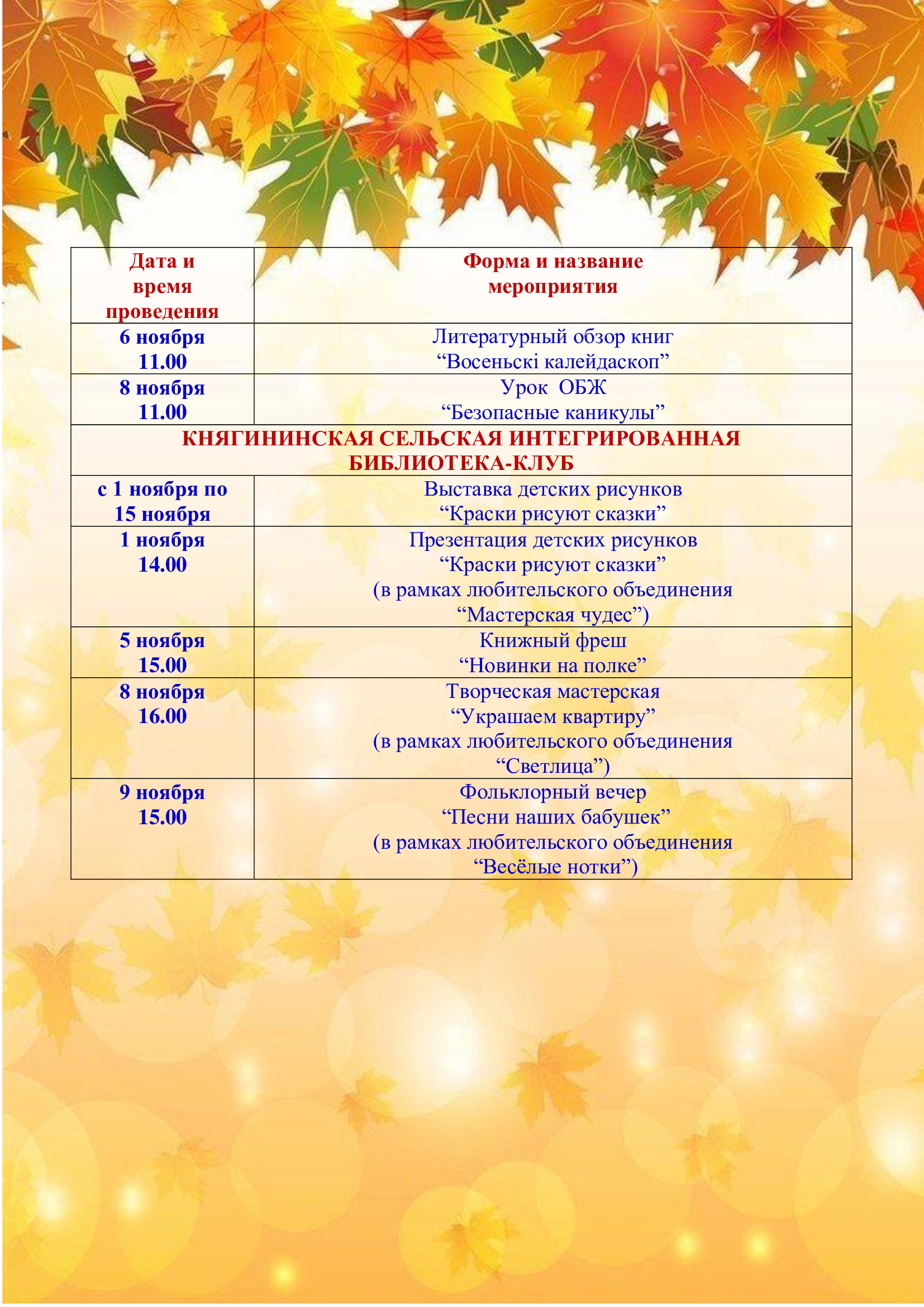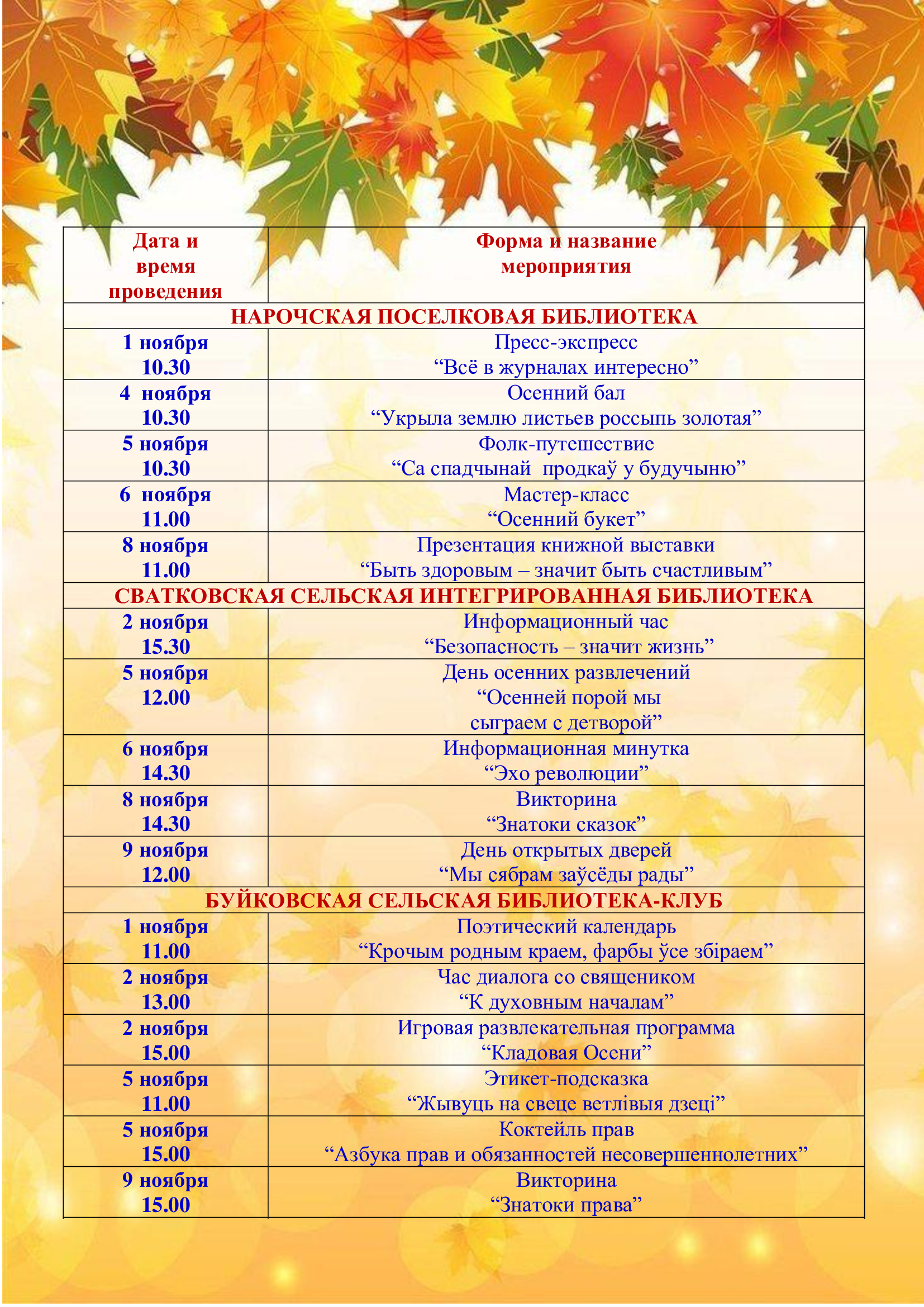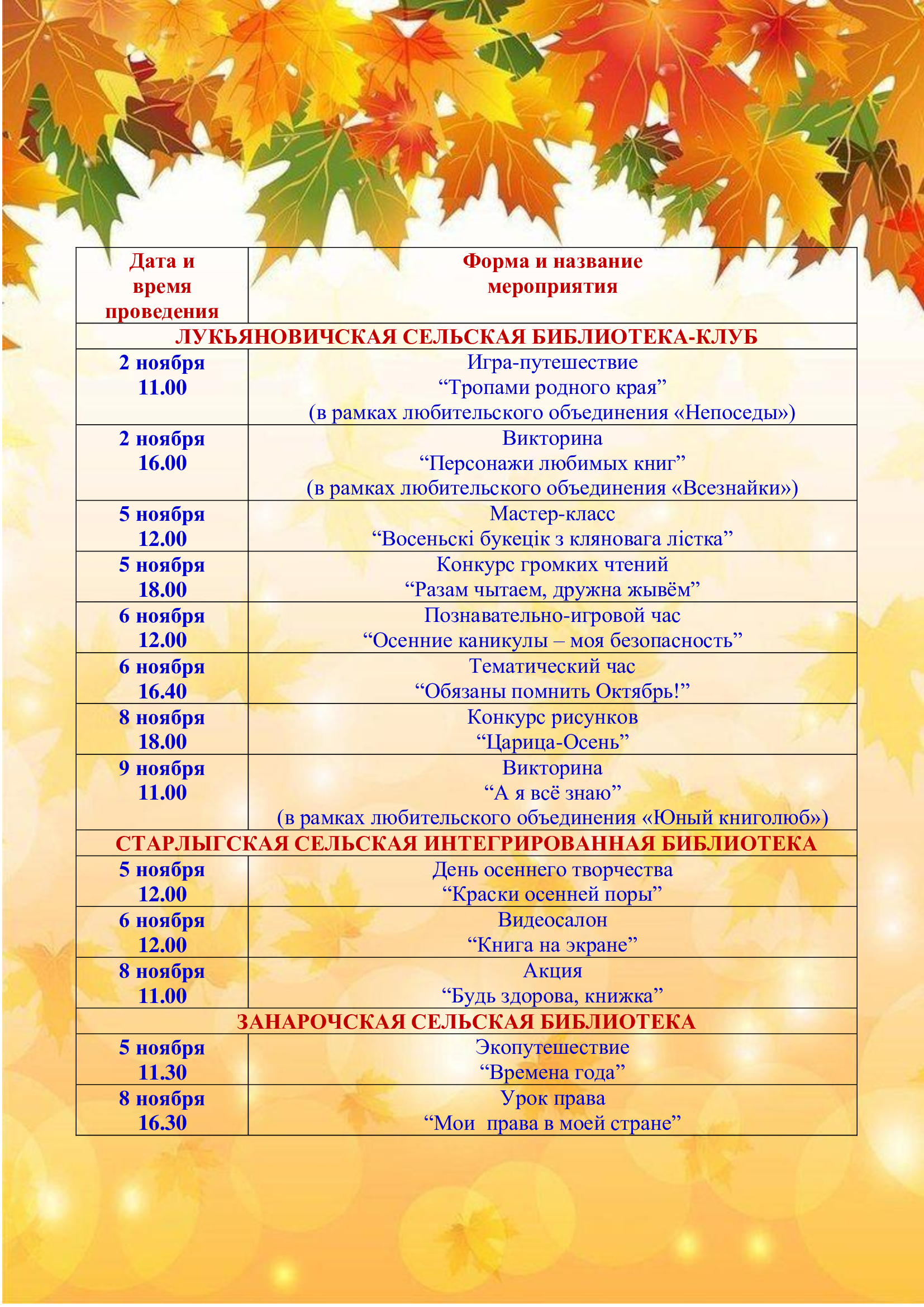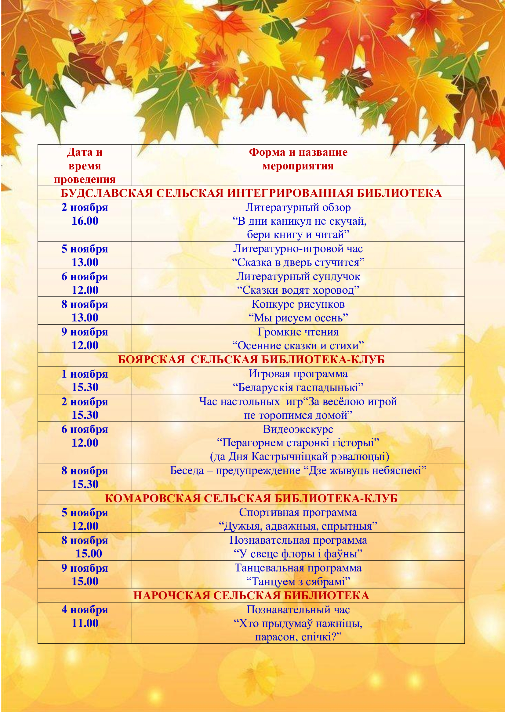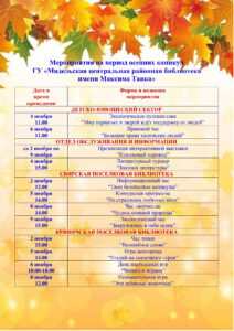 Мероприятия на период осенних каникул ГУ «Мядельская центральная районная библиотека имени Максима Танка» Оставьте комментарий / Uncategorized / От Администратор Уважаемые друзья! Приглашаем всех желающих посетить наши учреждения во время каникул! Библиотеки порадует вас разнообразными мероприятиями, которые сделают ваш досуг ярким, интересным и содержательным! Ждём Вас в библиотеках!