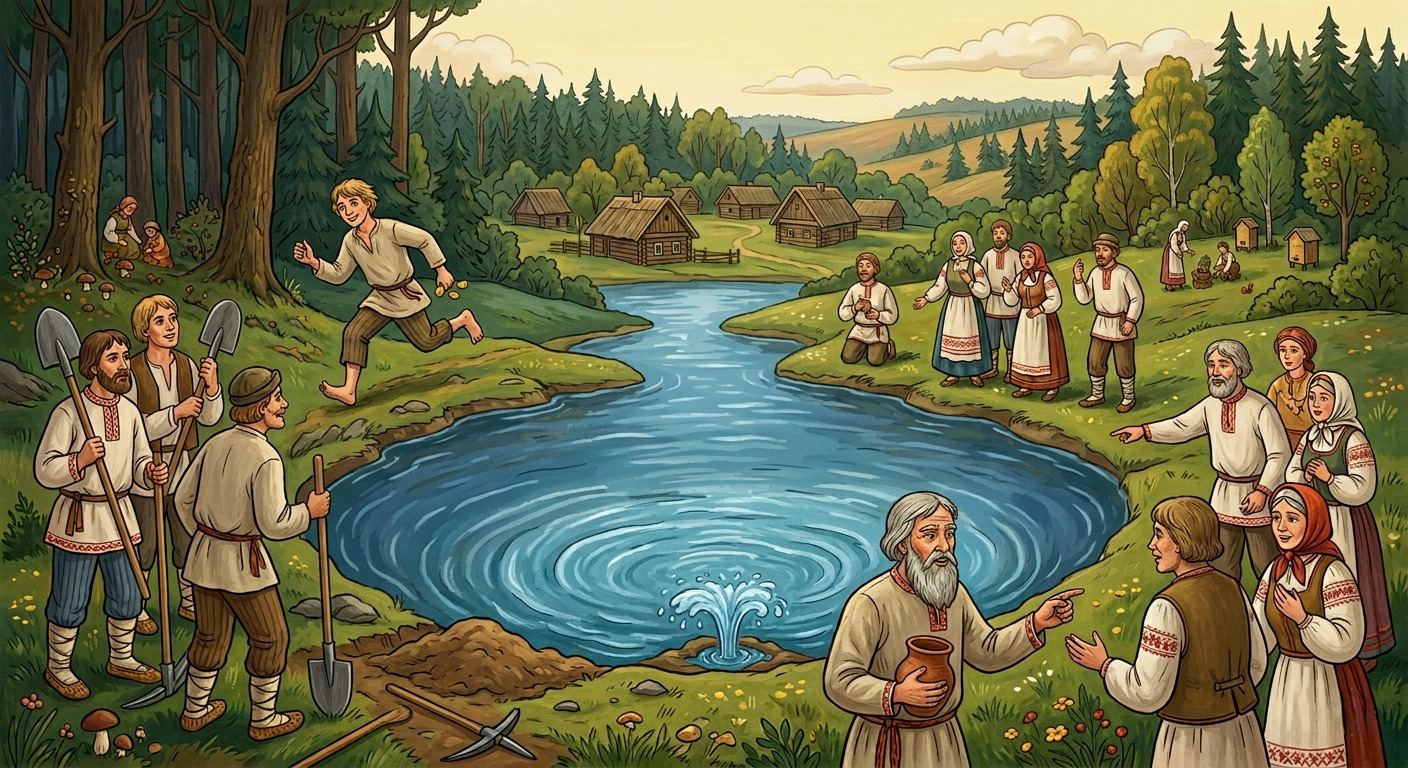 Як раз пад тым катлаванам, дзе людзі патрацілі нямала сіл, працякала падводная рака. Адзін струмень падаўся ўверх і прабіў адтуліну. Забурліў, запеніўся фантан. Катлаван поўніўся празрыстай вадой. Людзі моўчкі стаялі і дзівіліся такой з’яве. Потым схамянуліся і сталі казаць: