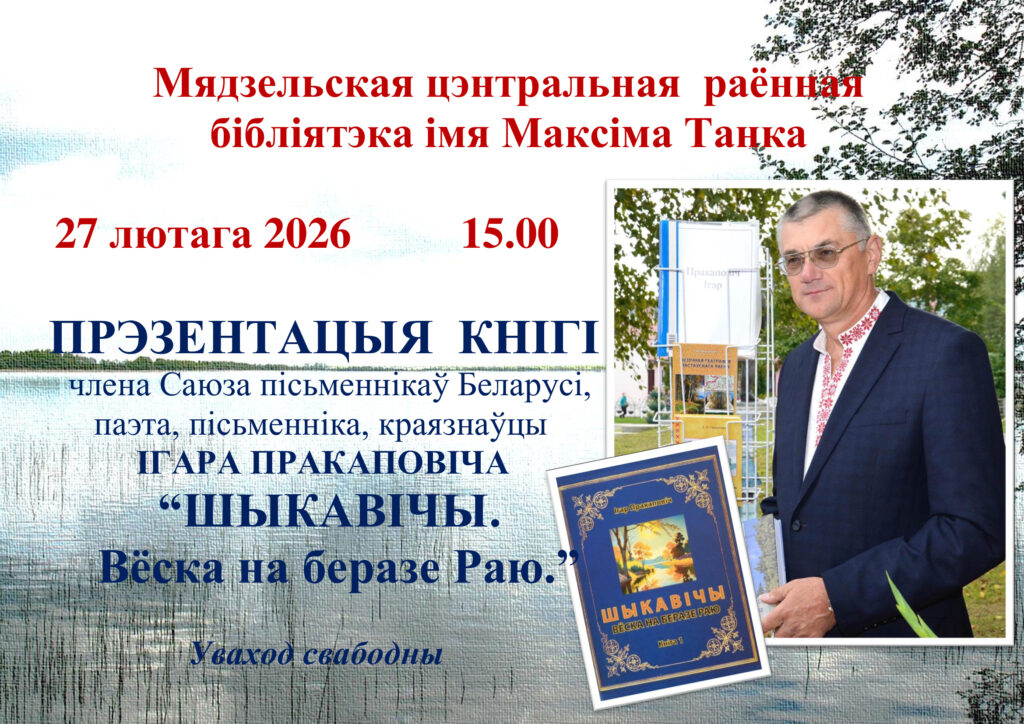 Мядзельская цэнтральная раённая бібліятэка імя Максіма Танка запрашае на прэзентацыю кнігі Ігара Пракаповіча «Шыкавічы. Вёска на беразе Раю». Адбудзецца мерапрыемства 27 лютага ў 15:00. На сустрэчы аўтар – ганаровы член Саюза пісьменнікаў Беларусі і краязнаўца – прадставіць выданне, раскажа пра працу над кнігай і адкажа на пытанні чытачоў. Запрашаем усіх, хто цікавіцца гісторыяй і жыццём родных …