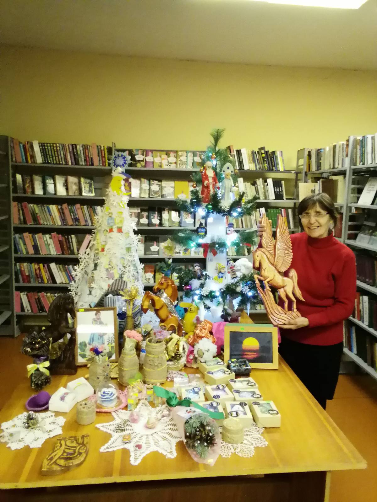 Да сустрэчы Новага Года рыхтуюцца ўсе бібліятэкі раёна. Праходзяць цікавыя мерапрыемствы і майстар-класы. Так у Княгінінскай сельскай бібліятэцы-клубе адбылося чарговае пасяджэнне аматарскага аб’яднання “Святліца”. Яго ўдзельнікаў і астатніх наведвальнікаў прывабіла арт-выстава работ майстроў аб’яднання “Навагодняе свята на сувеніры багата”, якая ладзіцца ў бібліятэцы: зацікавілі новыя вырабы і сувеніры, з якімі пазнаёміла кіраўнік аб’яднання Наталля Свечкарова. Гэта мыла ручной работы на навагоднюю тэматыку і вышытыя завушніцы ад Аляксандра Мальца, сувеніры з дрэва Мікалая Свечкарова, упрыгожванні з прыродных матэрыялаў, з бісеру, вазы і шкатулкі Крысціны Грузд.